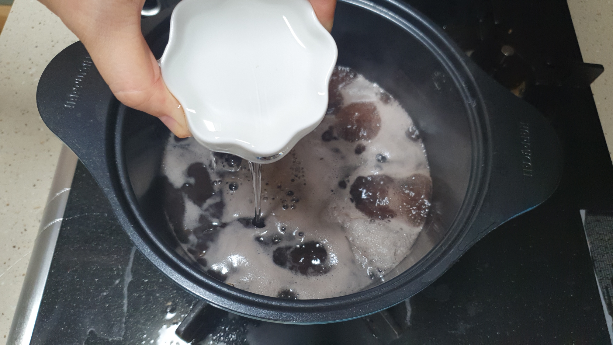 15분이 지나면 혹은 자꾸 넘쳐 흐른다면 약불로 줄여주세요. 그리고 불순물거품을 걷어내어줍니다. 그리고 간을 맞추겠습니다.