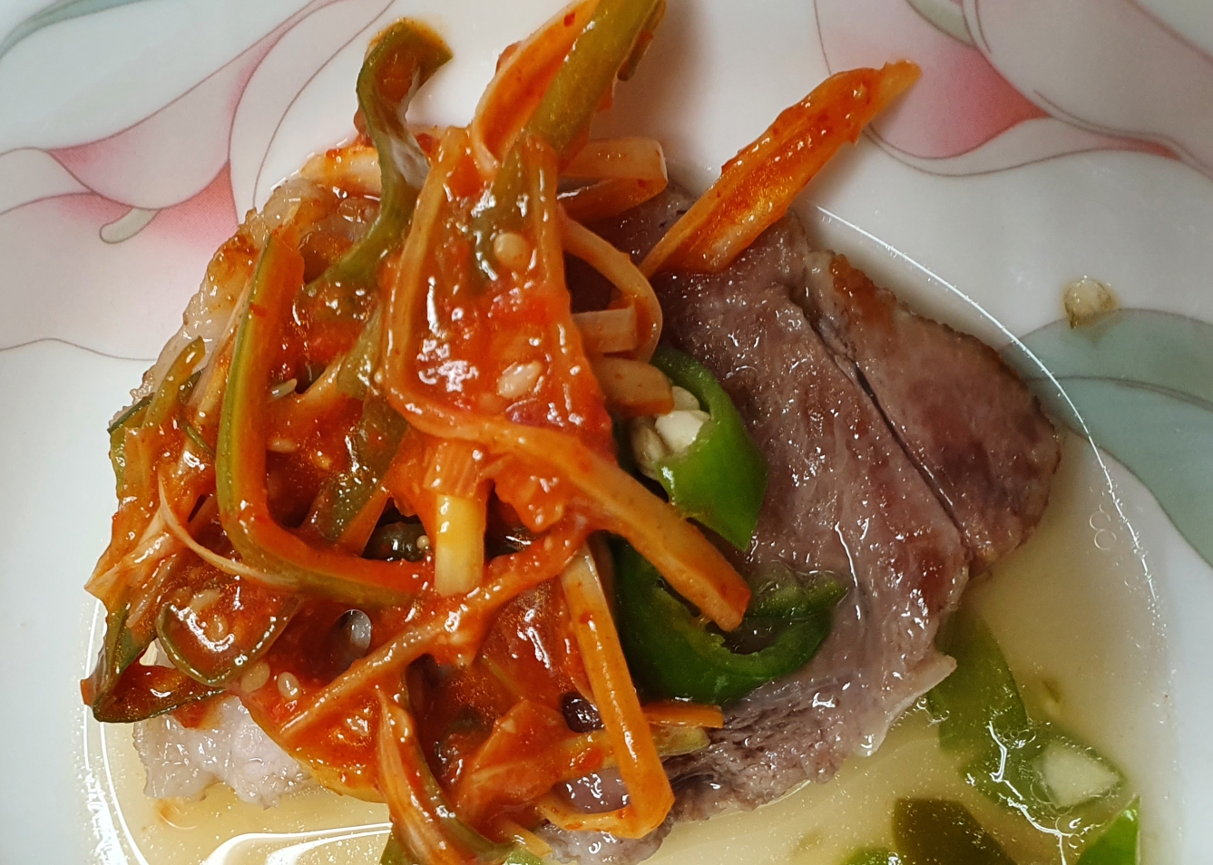 새우젓에 담갔던 고기 한 점 위에 파절임도 올려본다.